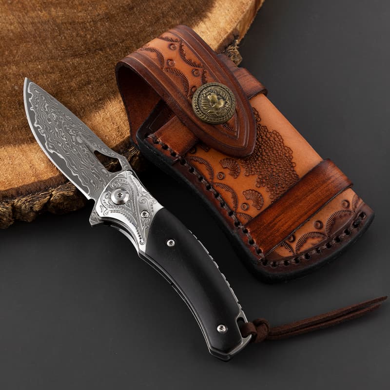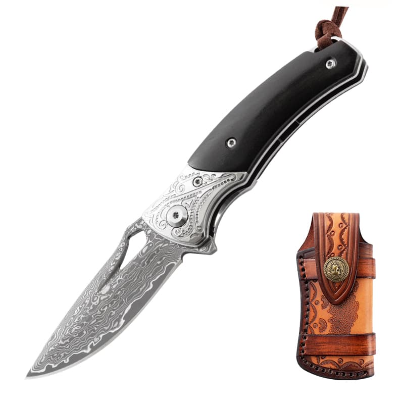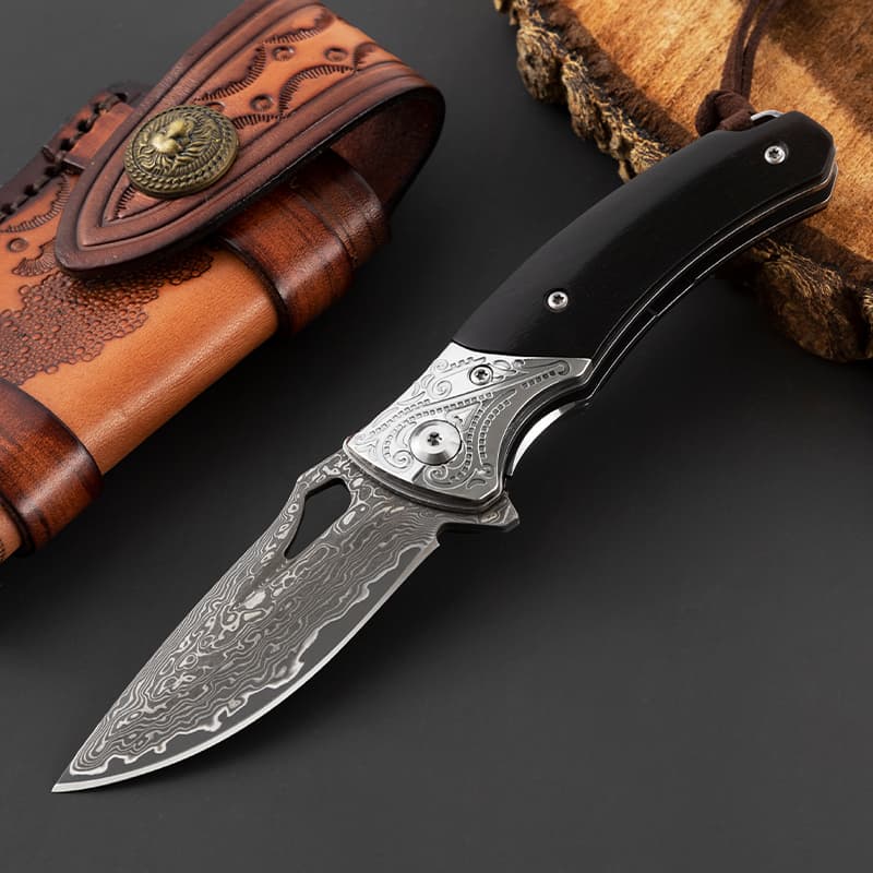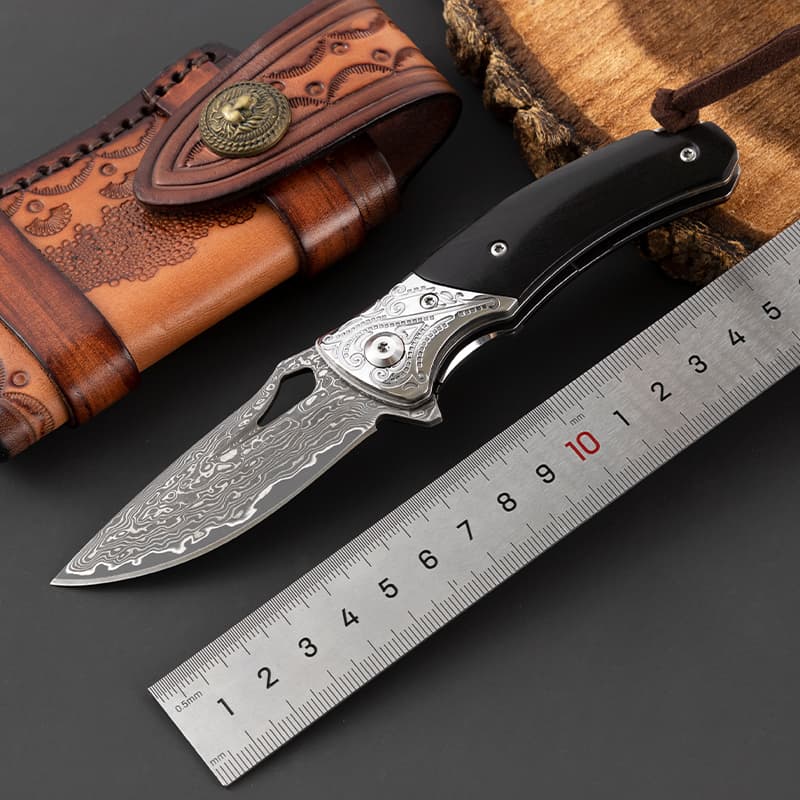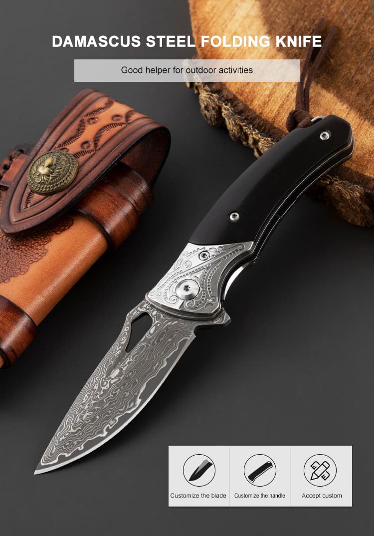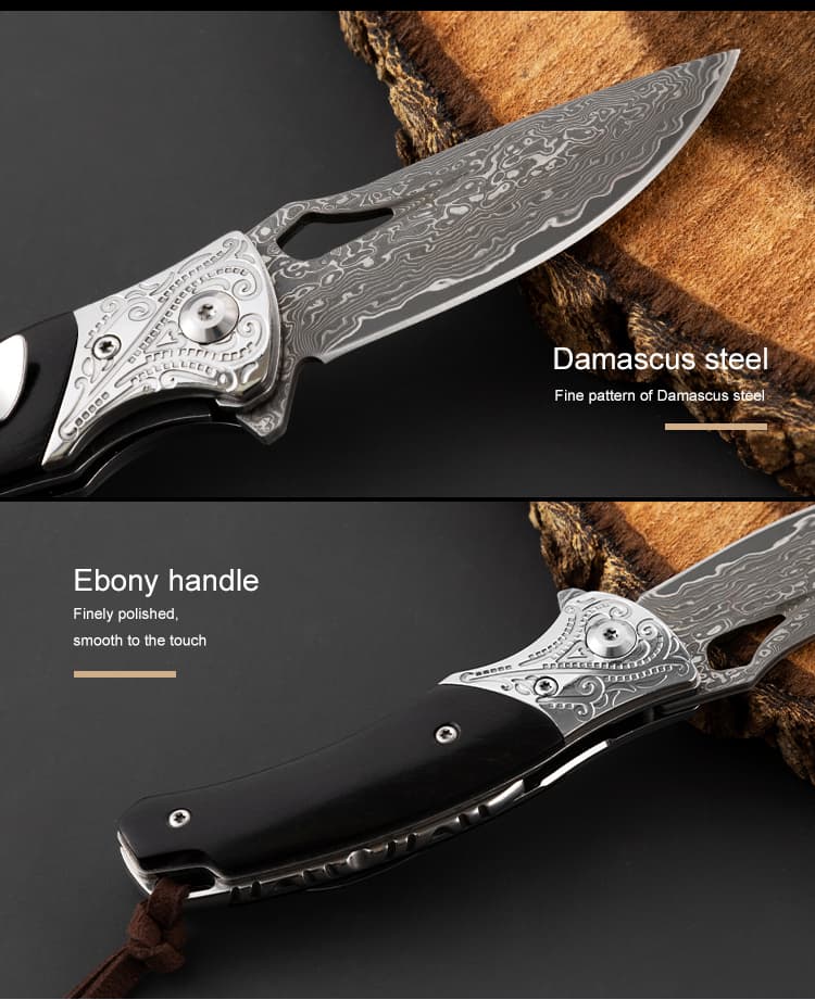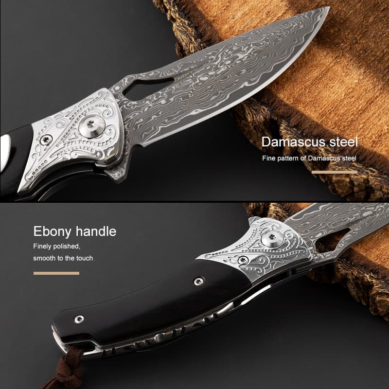 Damascus EDC Engraved Abalone Pocket Knife Gift Ebony Wooden Handle Folding Knife Anniversary Husband Father Wedding