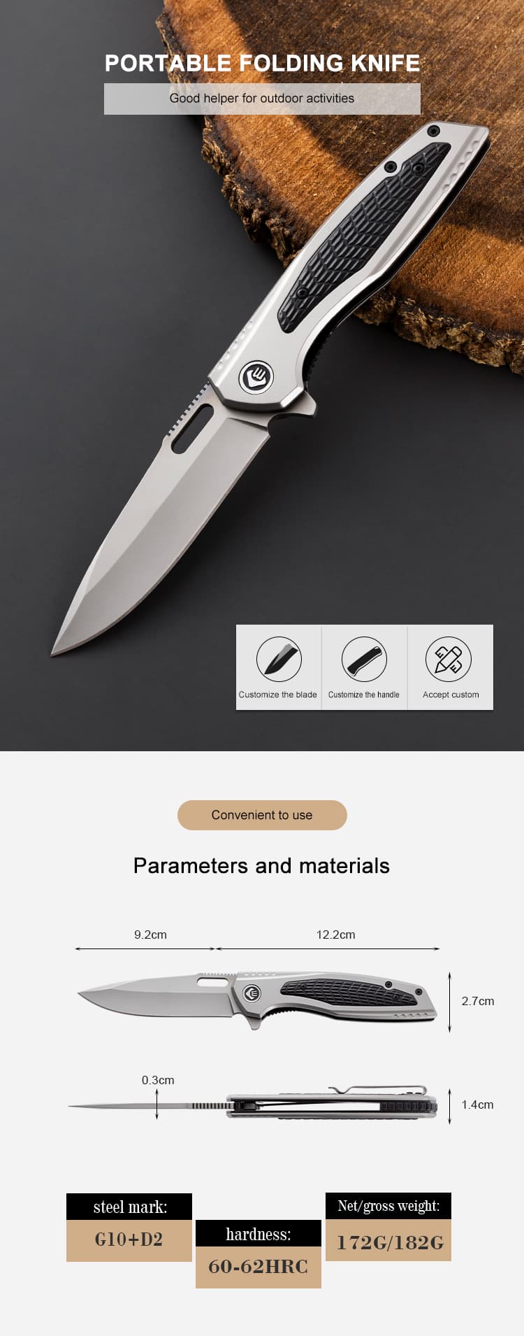 Hongrui is a factory with a history of 31 years, dedicated to design, development, and production. It sells outdoor knives, outdoor tools, life-saving tools, hardware products, plastic products, and kitchen supplies. The company has a complete and scientific quality management system. We support any customization and welcome your email. Feature: Multifunctional Place of Origin: Guangdong, China Customized support: OEM, OBM Material :3Cr13Mov steel+Aluminium alloy Sample Time: 3 - 7 Days Packing box: box or custom Logo: Accept Custom Logo