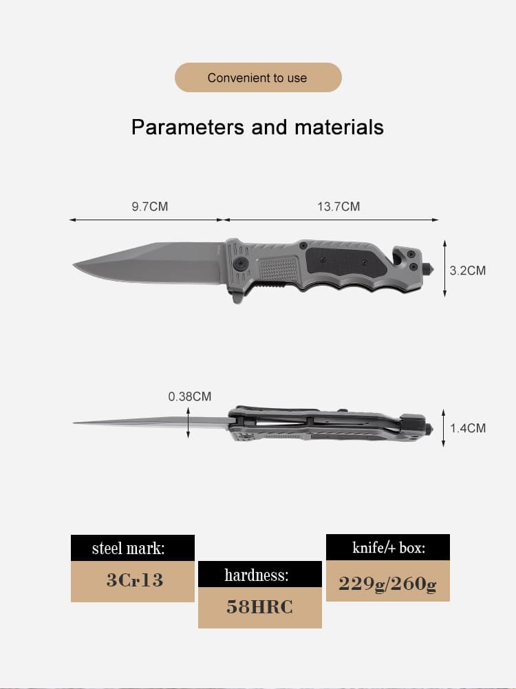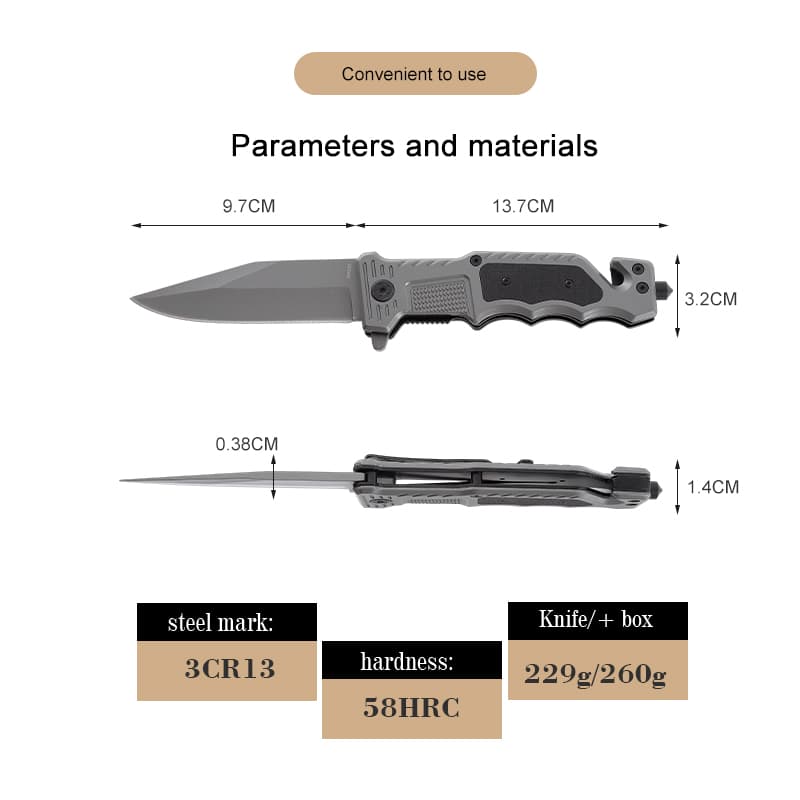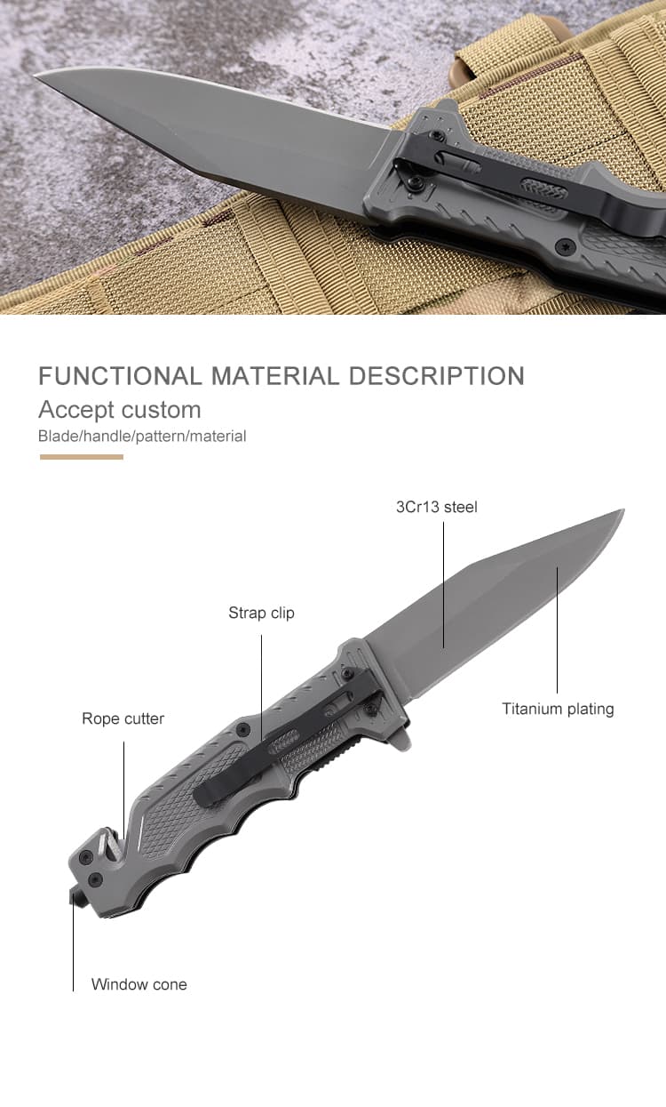 Hongrui is a factory with a history of 31 years, dedicated to design, development, and production. It sells outdoor knives, outdoor tools, life-saving tools, hardware products, plastic products, and kitchen supplies. The company has a complete and scientific quality management system. We support any customization and welcome your email. Feature: Multifunctional Place of Origin: Guangdong, China Customized support: OEM, OBM Material :3Cr13Mov steel+Aluminium alloy Sample Time: 3 - 7 Days Packing box: box or custom Logo: Accept Custom Logo