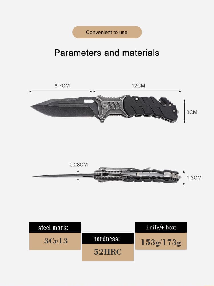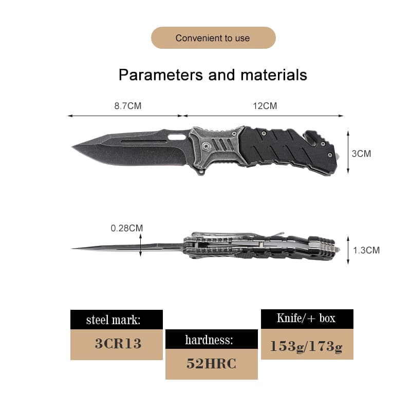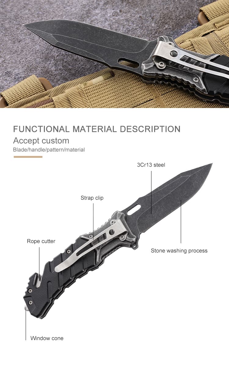 Hongrui is a factory with a history of 31 years, dedicated to design, development, and production. It sells outdoor knives, outdoor tools, life-saving tools, hardware products, plastic products, and kitchen supplies. The company has a complete and scientific quality management system. We support any customization and welcome your email. Feature: Multifunctional Place of Origin: Guangdong, China Customized support: OEM, OBM Material :3Cr13Mov steel+Aluminium alloy Sample Time: 3 - 7 Days Packing box: box or custom Logo: Accept Custom Logo