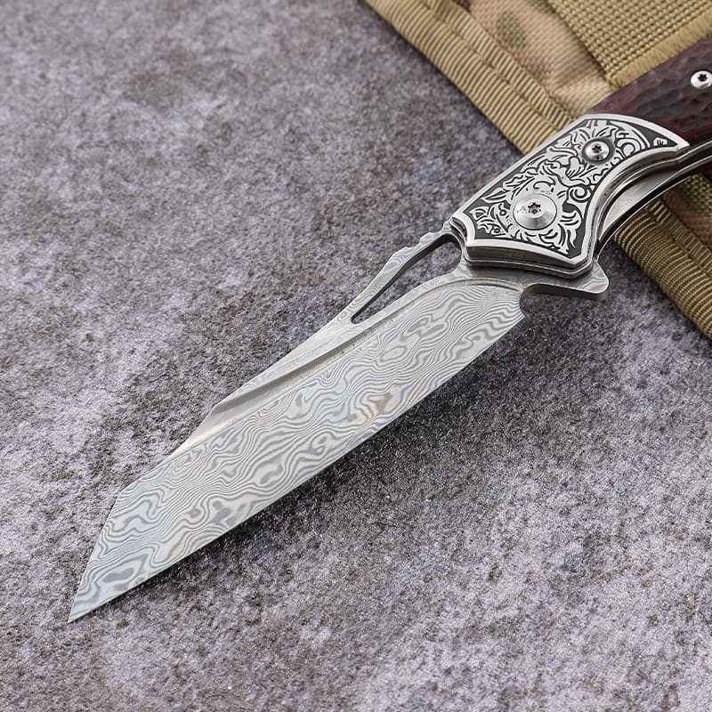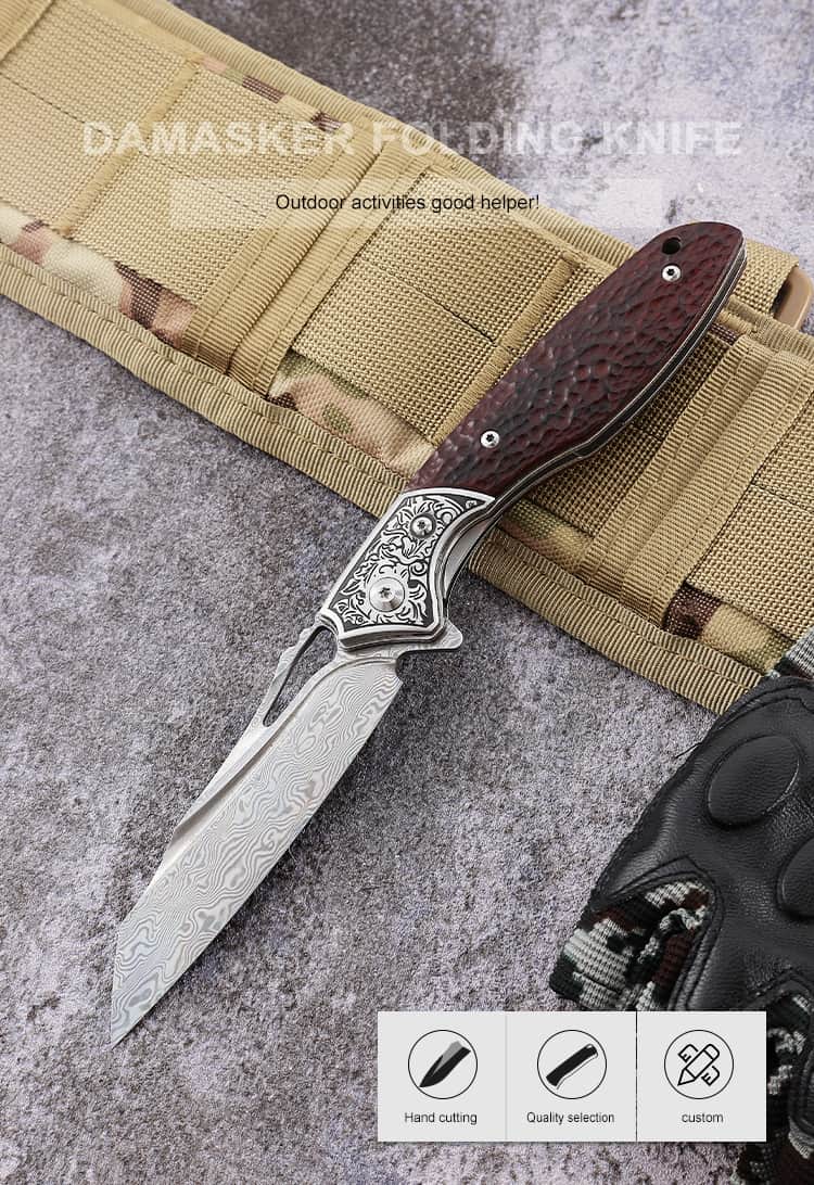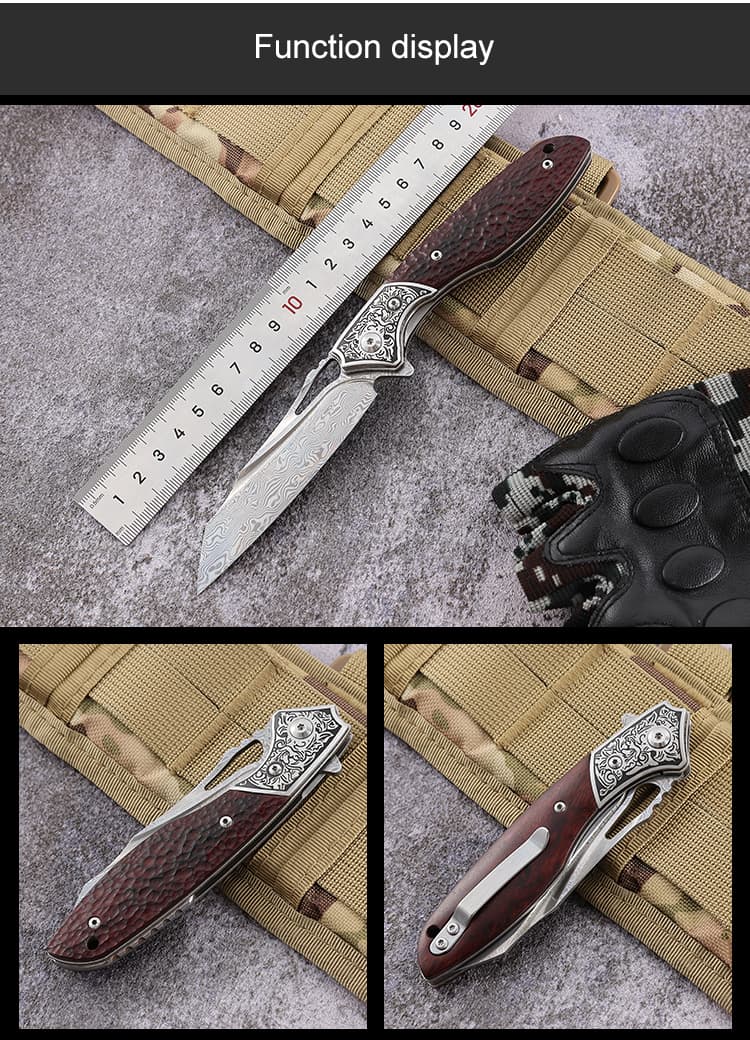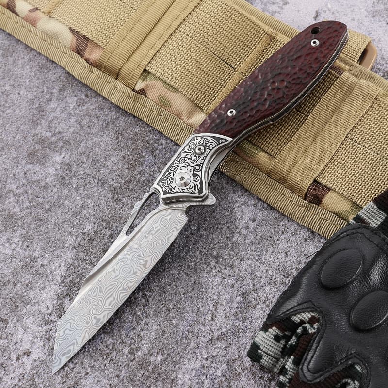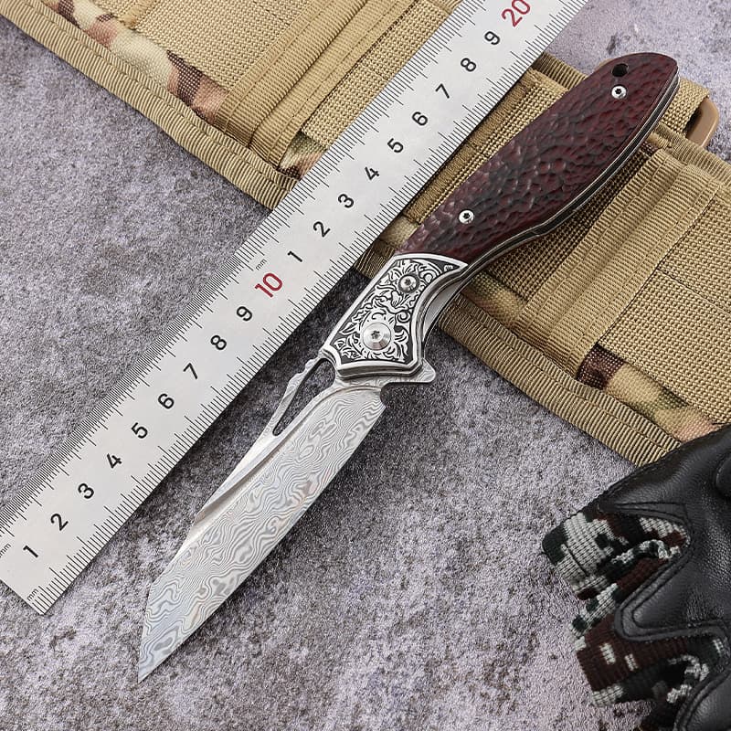 New Damascus Steel Blade Self Defense Tactical Wooden Handle Folding Pocket Knife Camping Hunting Damascus Knife EDC