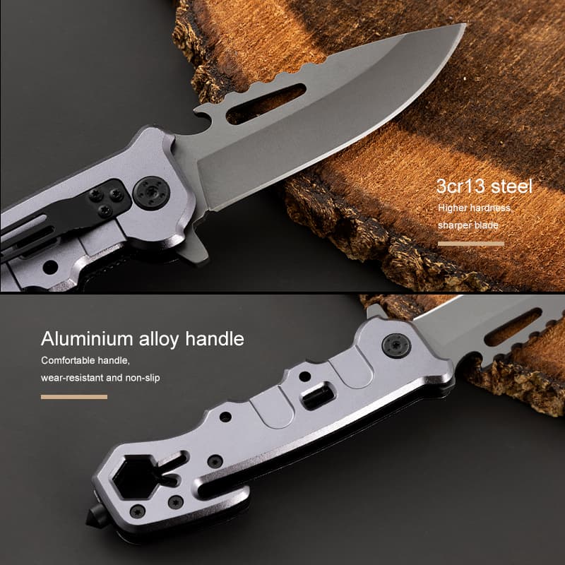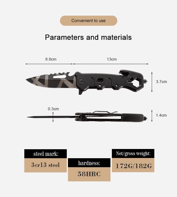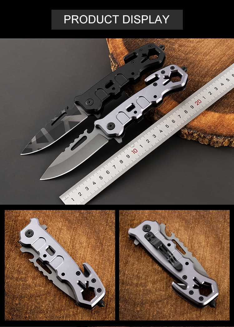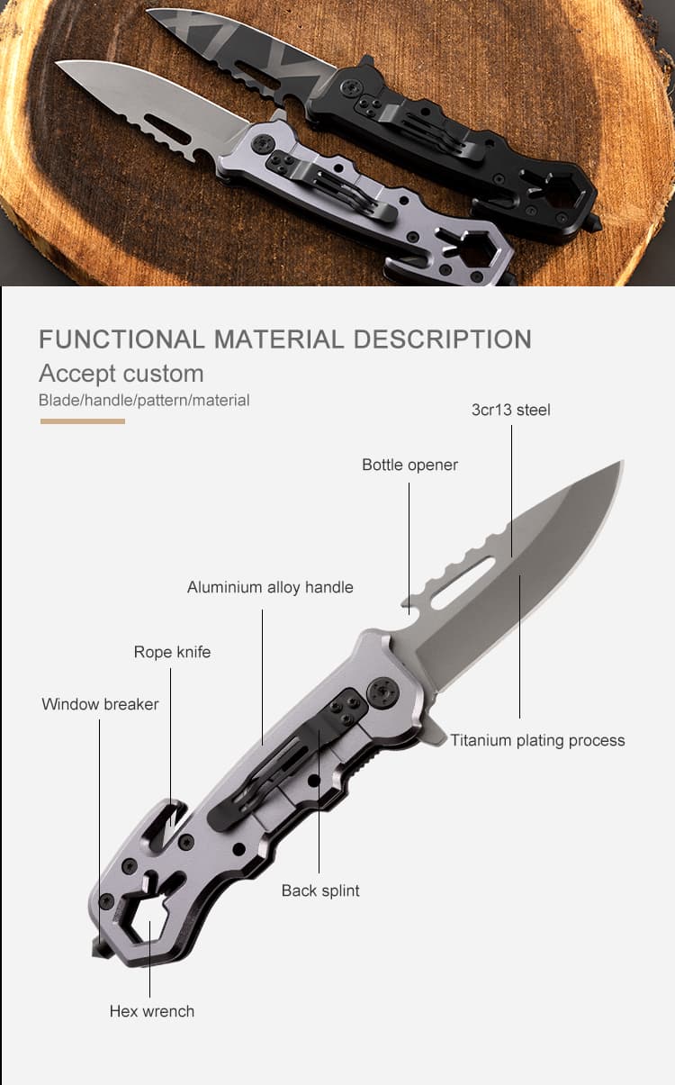 Hongrui is a factory with a history of 31 years, dedicated to design, development, and production. It sells outdoor knives, outdoor tools, life-saving tools, hardware products, plastic products, and kitchen supplies. The company has a complete and scientific quality management system. We support any customization and welcome your email. Feature: Multifunctional Place of Origin: Guangdong, China Customized support: OEM, OBM Material :3Cr13Mov steel+Aluminium alloy Sample Time: 3 - 7 Days Packing box: box or custom Logo: Accept Custom Logo